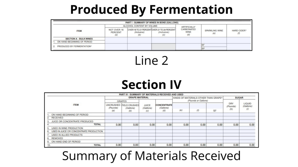 Listing gallons produced by fermentation without matching materials received and used in Section 4 is a big no-no to the TTB, although it may seem counterintuitive to some. Think of this as your bulk weight to volume – you can’t make wine out of nothing!