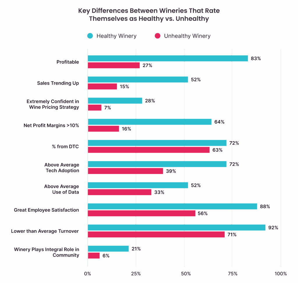 - Technology adoption is a defining factor. 65% of high-tech wineries reported strong health, compared to only 14% of low adopters.