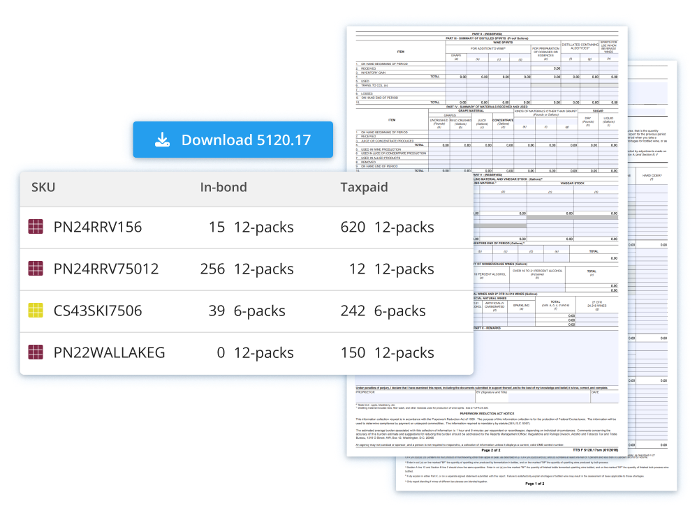 Gone are the days of not knowing what you actually have on hand. With streamlined tracking of your case goods from bottling to sale, know the physical count of each product at each location, whether that be in-bond or taxpaid.