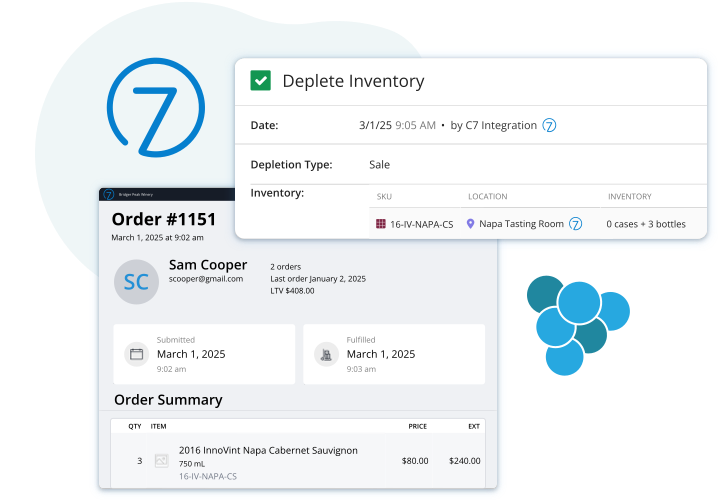 SUPPLY connects your inventory and DTC sales channels with a real-time, two-way sync with Commerce7. Orders fulfilled in Commerce7 instantly deplete SUPPLY inventory, and restocks update in Commerce7 without manual entry. Tasting room staff see accurate inventory right where they work. No extra logins, no double entry, no errors.